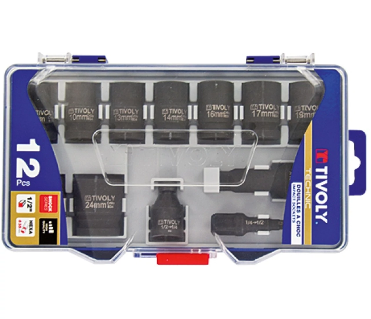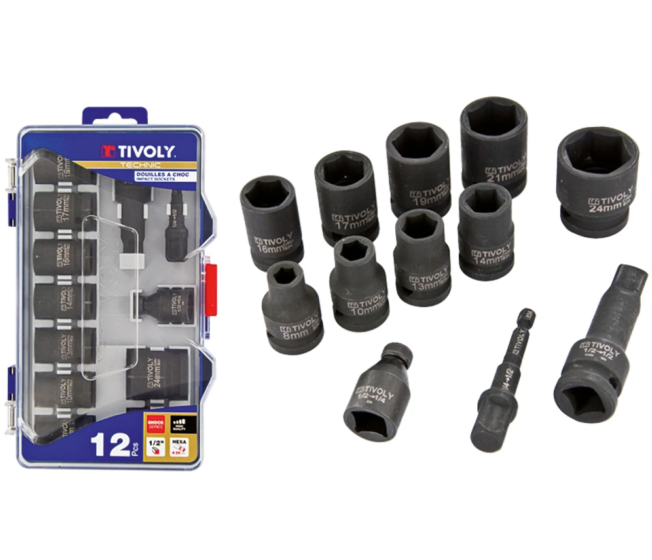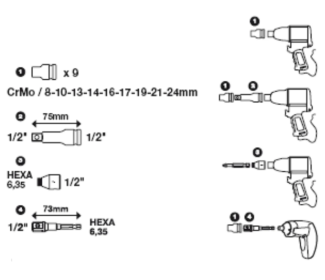 8, 10, 13, 14, 16, 17, 19, 21 és 24 mm + 3 adapter pneumatikus és elektromos ütve-csavarozó gépbe való befogáshoz.