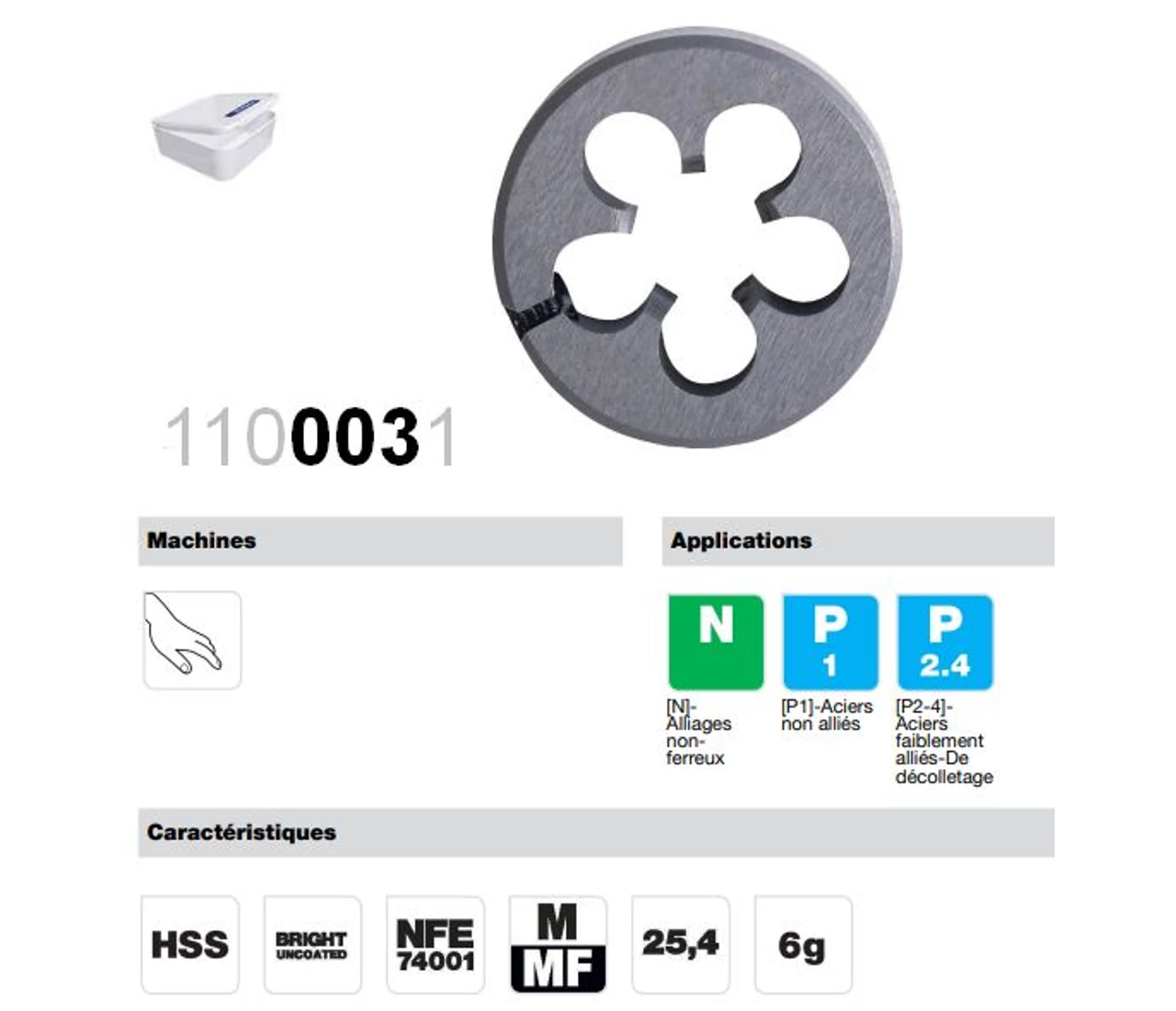 CrV szerszámacél metsző M-menethez alkalmi használatra lágy fémekhez. Ø25,4 mm befogás.