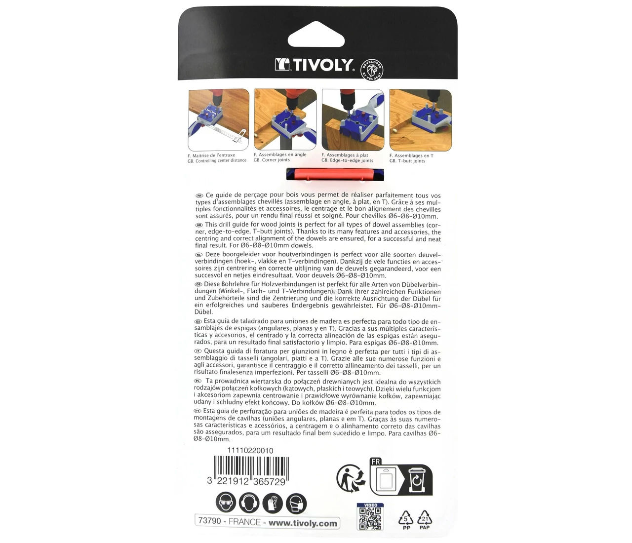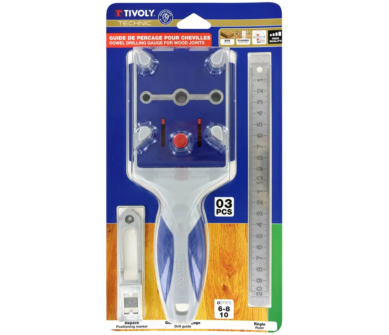 A Tivoly fúróvezető sablon segíti a lapok tökéletes illesztését. Gyors, pontos és egyszerű lesz a bútorlapok összeszerelése sarok-, T- és sík kötések esetén. A készlet tartalmaz egy milliméterpontos beosztású, 20 cm-es vonalzót és egy állítható távolságmérőt a sorozatfúrásokhoz. A sablon Ø6, Ø8 és Ø10 mm-es edzett acél vezetőhüvelyekkel rendelkezik, így kemény- és puhafához egyaránt ideális választás a gyors és precíz asztalosmunkákhoz.