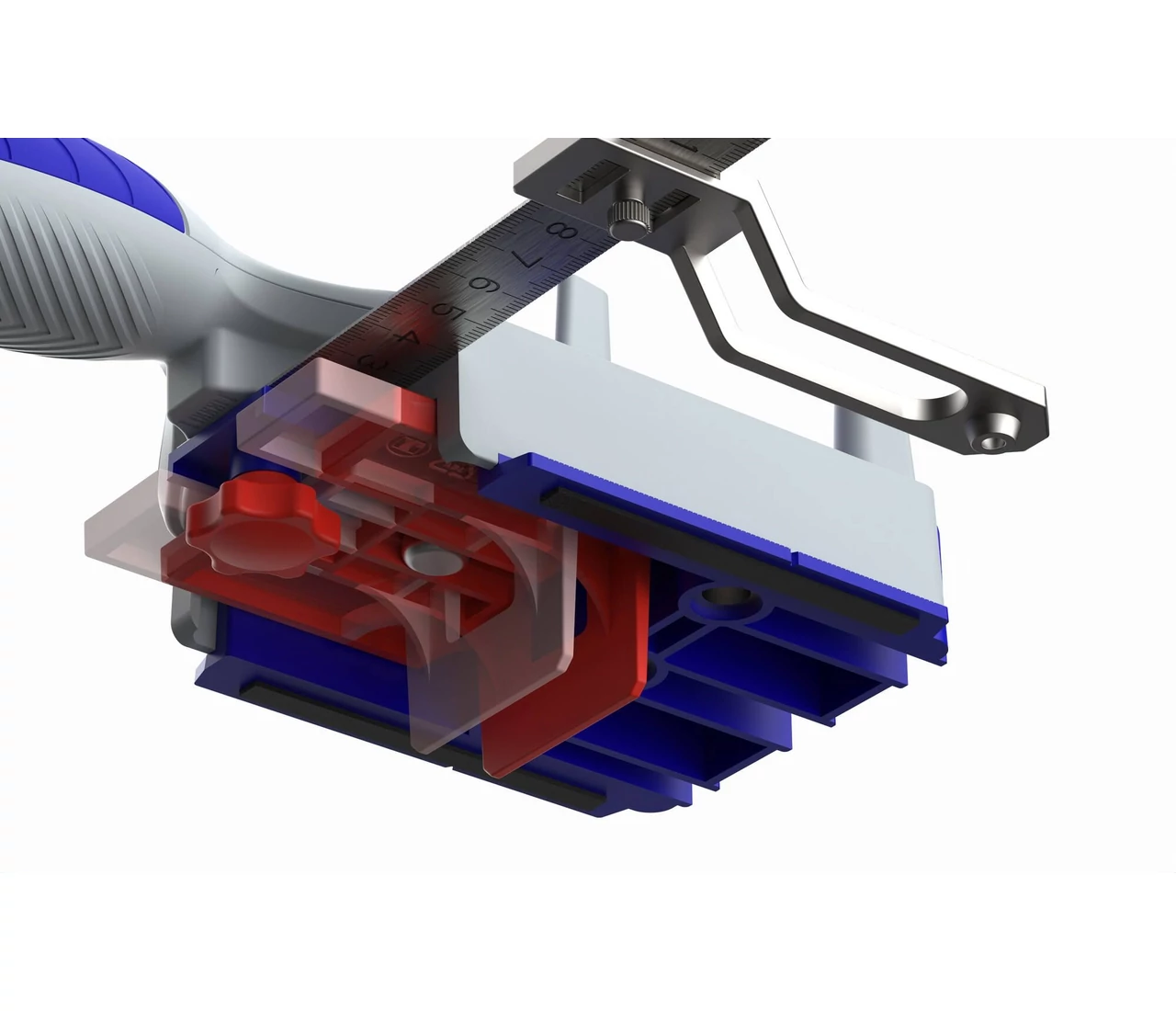 A szett tartalmazza magát a fúróvezető sablont a 3 méretű hüvellyel, egy 20 cm-es integrált vonalzót, valamint egy távolságjelölő elemet a sorozatfúrások megkönnyítéséhez.