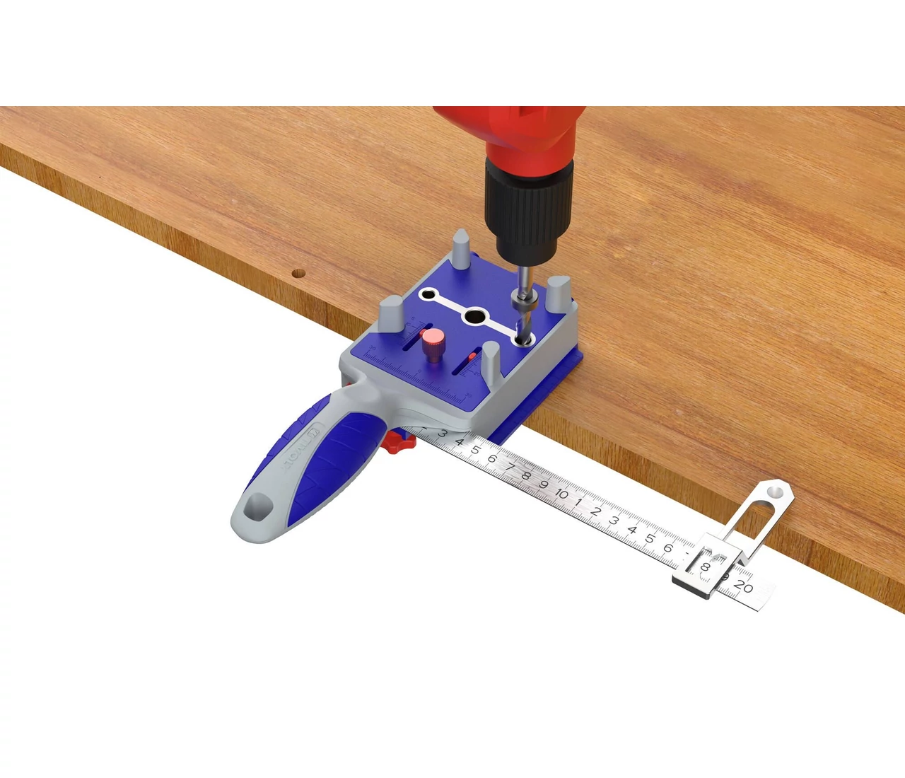 Helyezd a sablont a munkadarab szélére, állítsd be a kívánt távolságot a vonalzó segítségével, majd rögzítsd a pozíciót. A sablon megakadályozza a fúró elvándorlását a rostok között, így még a keményfában is pontos lesz a furat mélysége és iránya. A mellékelt jelölő tüskével a furatok helye egyszerűen átvihető az ellenoldali munkadarabra.